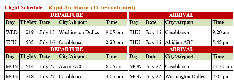Today you will board your Royal Air Maroc Flight #219 from Washington Dulles (IAD) @ 09:05 PM in route to Abidjan, Ivory Coast with a Stop in Casablanca. Flights included in the Air & Land Complete package to be confirmed by 12/31/2025.